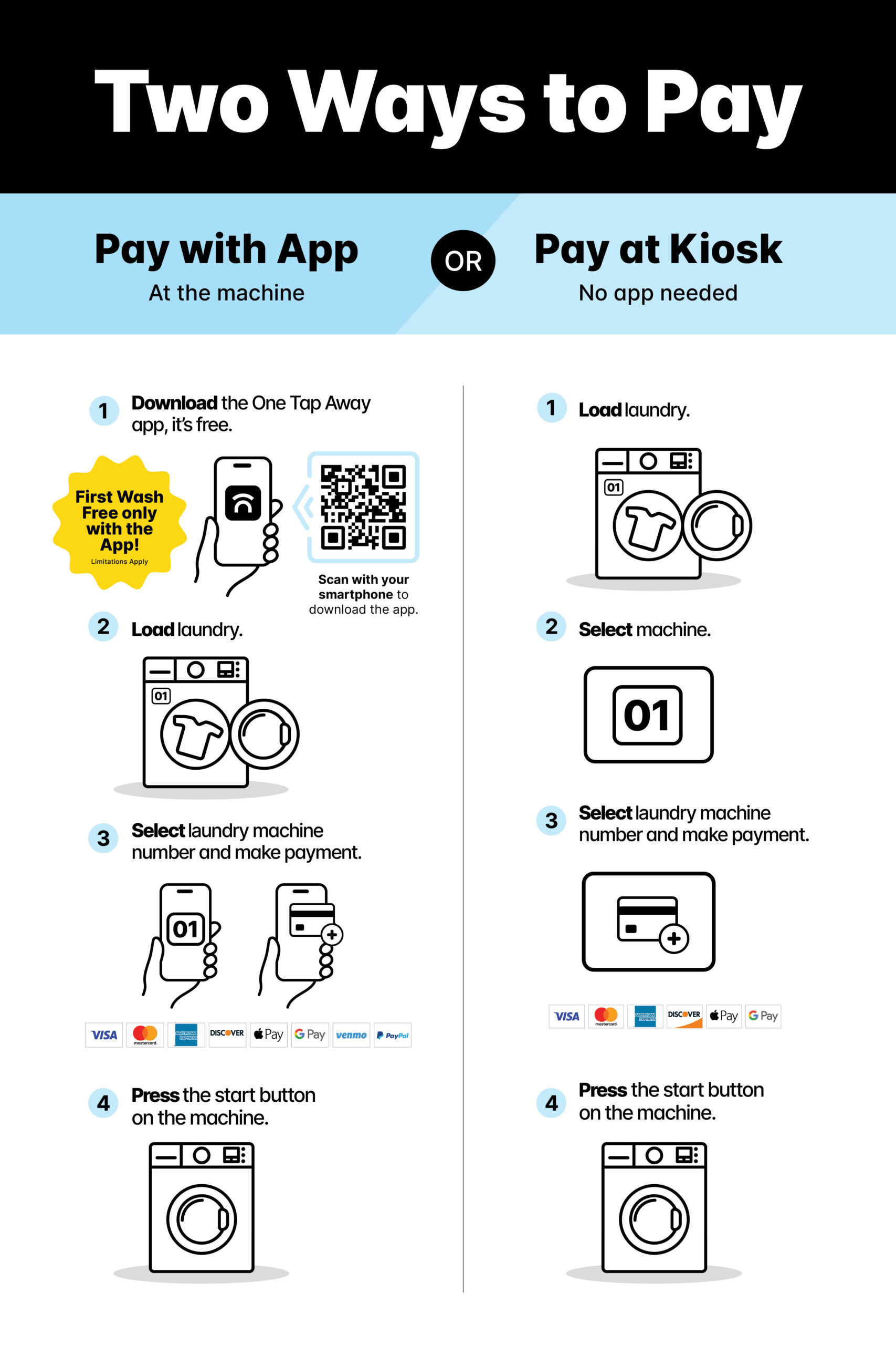 This poster will be installed by the CSC team in the laundry room(s) to inform residents how to download and use the app, request service, and get their first wash free! You can request replacements if needed.