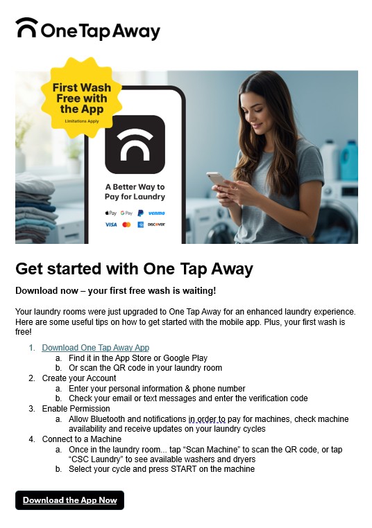 This flyer should be placed on or near the door of the laundry room (s) as an announcement that the technology has been upgraded to One Tap Away.